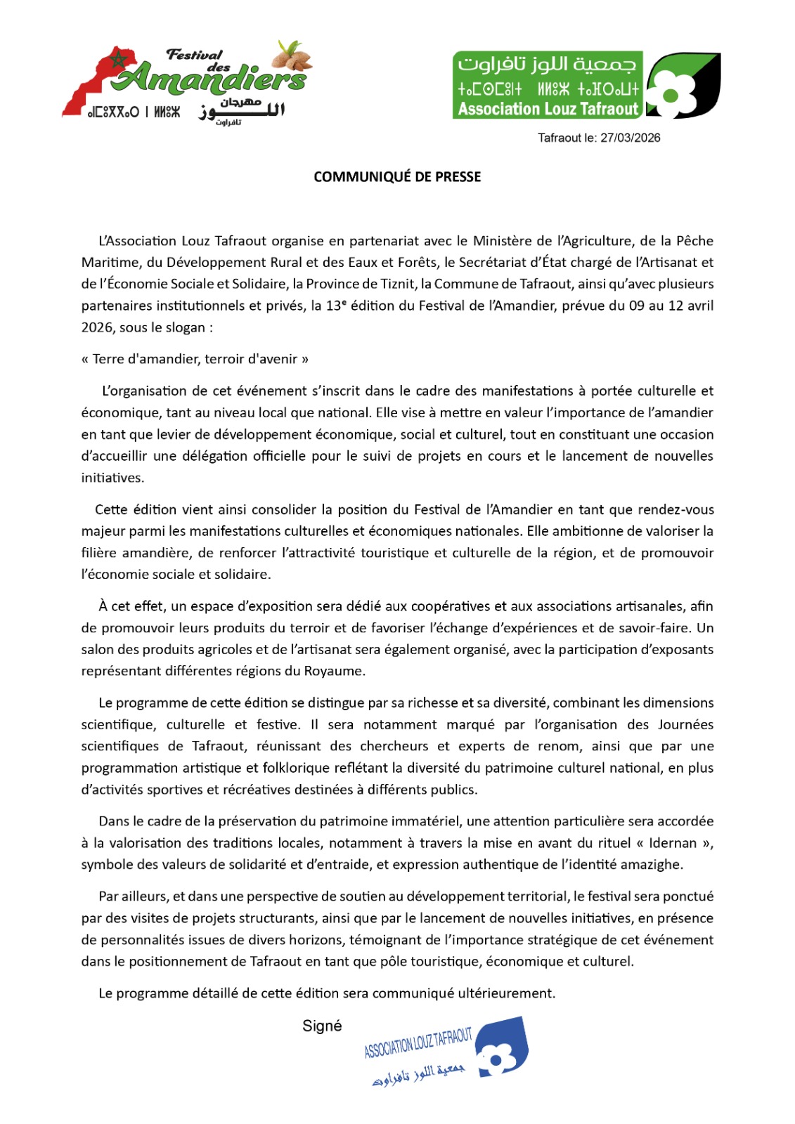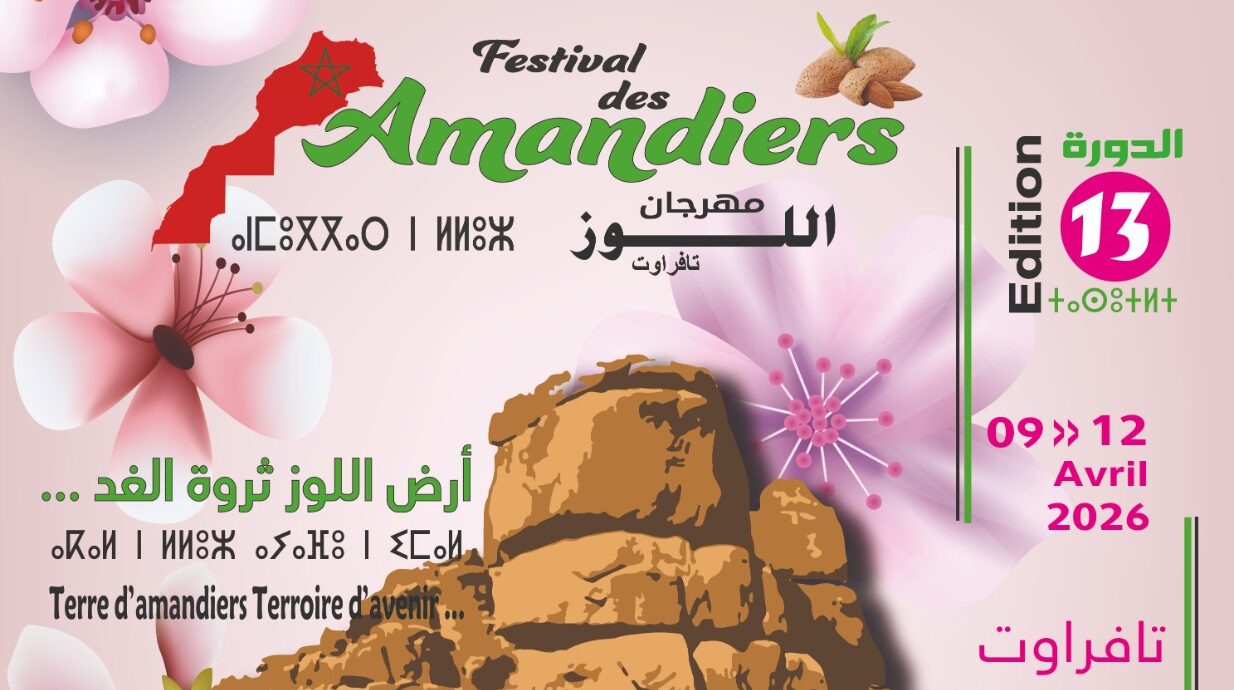 La ville de Tafraout se prépare à accueillir la 13e édition du Festival de l’amandier, prévue du 9 au 12 avril 2026, sous son slogan habituel : « Terre d’amandier… richesse de demain ». Cet événement est organisé par l’Association Amandier de Tafraout, en partenariat avec le ministère de l’Agriculture, de la Pêche maritime, du Développement rural et des Eaux et Forêts, le Secrétariat d’État chargé de l’Artisanat et de l’Économie sociale et solidaire, la préfecture de la province de Tiznit, la commune de Tafraout, ainsi que plusieurs partenaires institutionnels et privés.